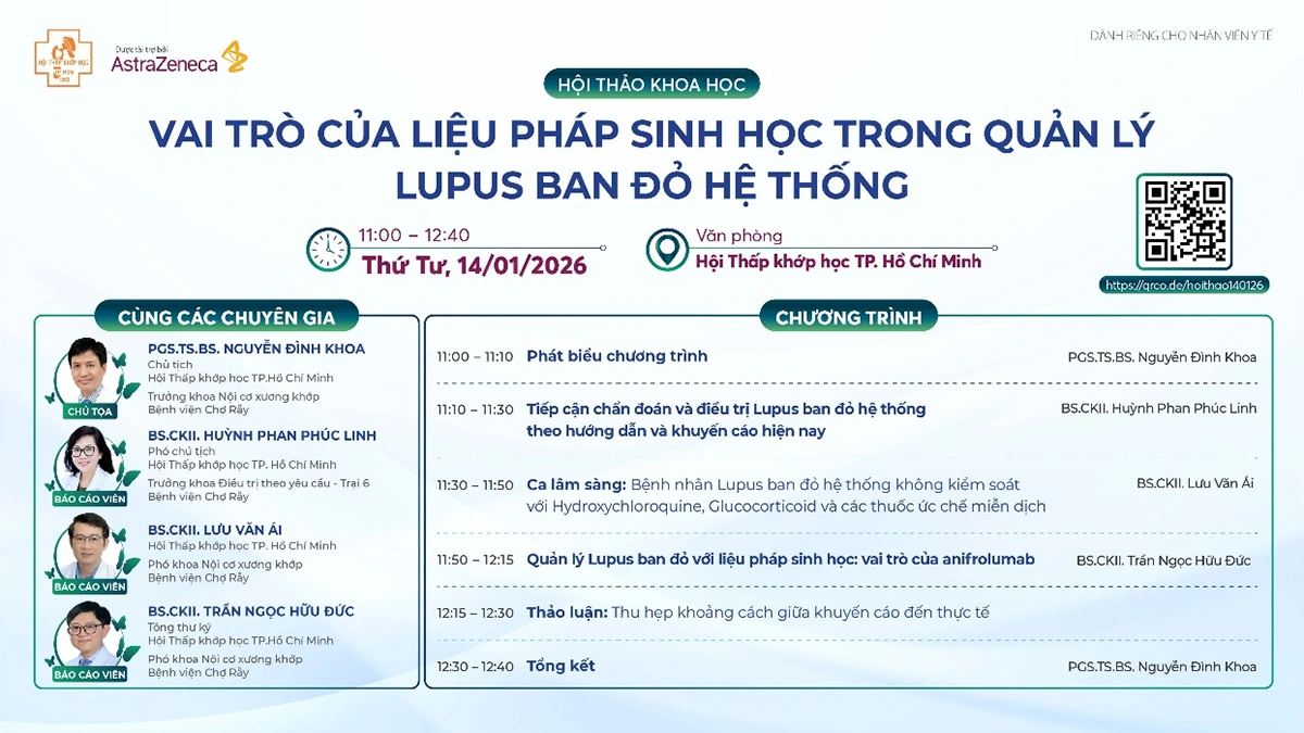 Trong khuôn khổ hội thảo, các chuyên gia sẽ trình bày và thảo luận những cập nhật mới nhất về liệu pháp sinh học trong điều trị Lupus ban đỏ hệ thống, đồng thời chia sẻ các khuyến cáo mới trong thực hành lâm sàng và những lưu ý quan trọng nhằm nâng cao hiệu quả điều trị cũng như chất lượng chăm sóc bệnh nhân trong bối cảnh hiện nay.